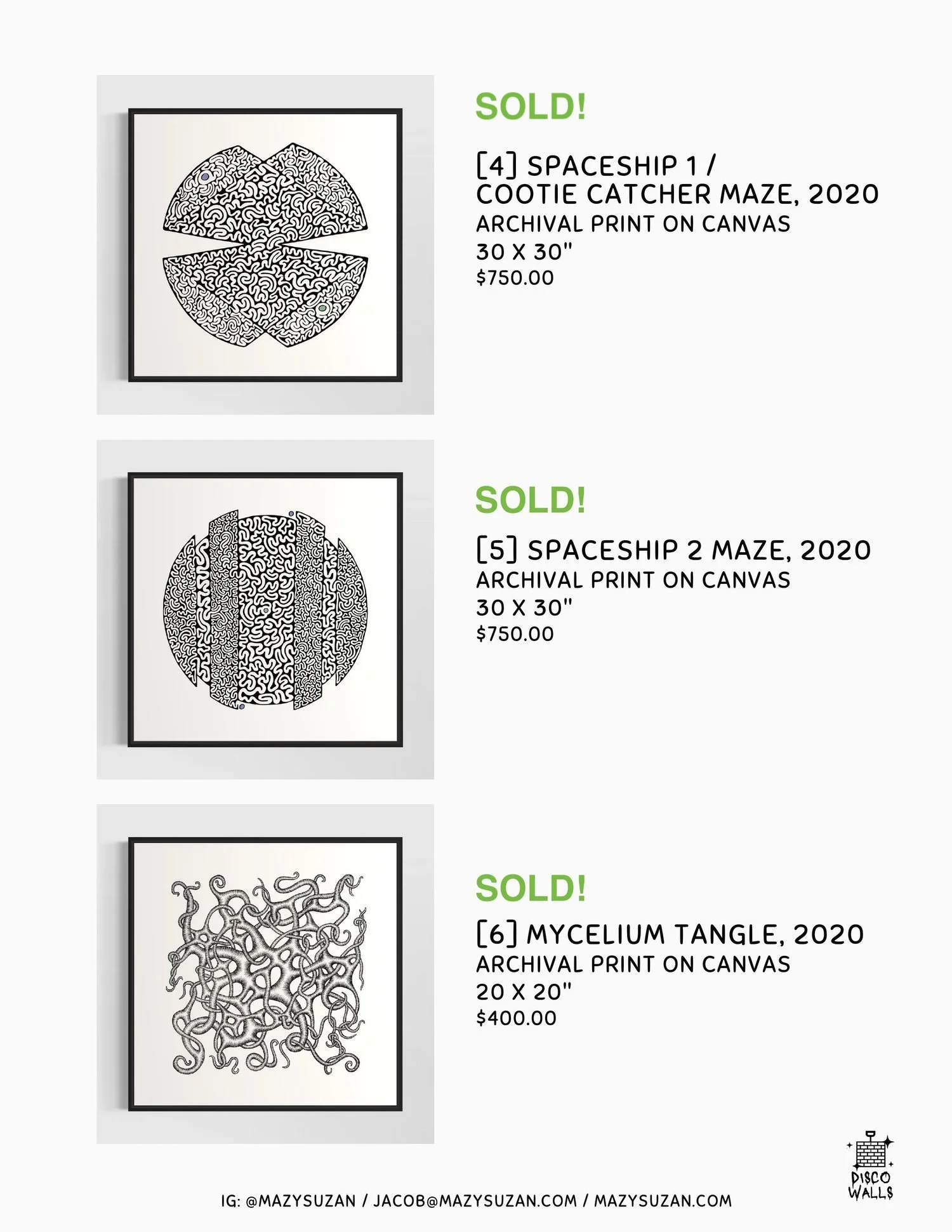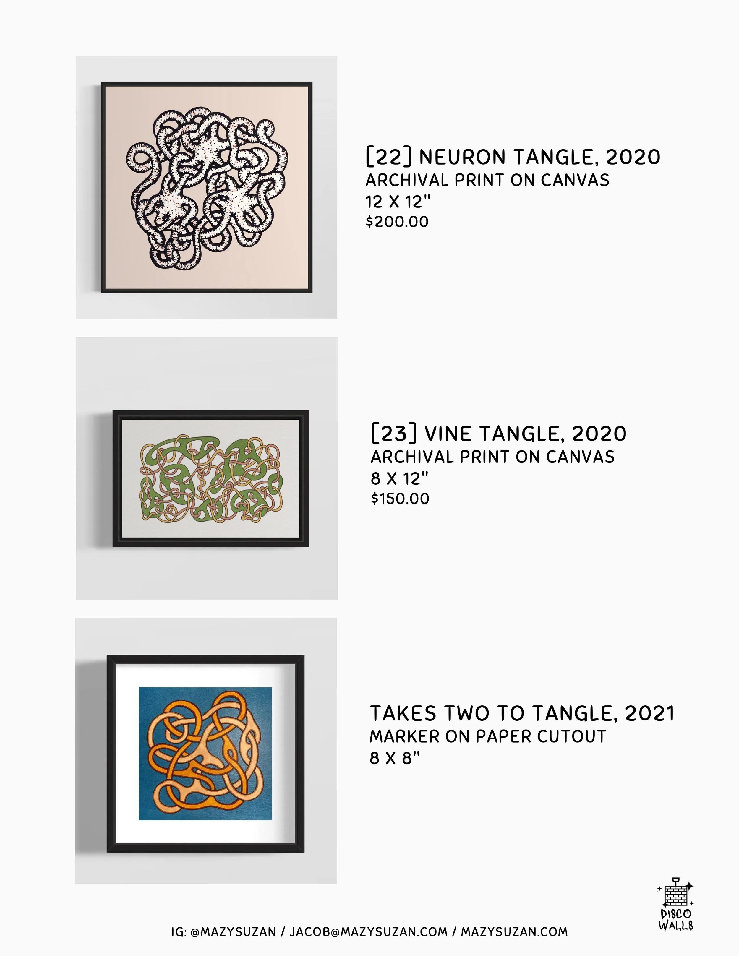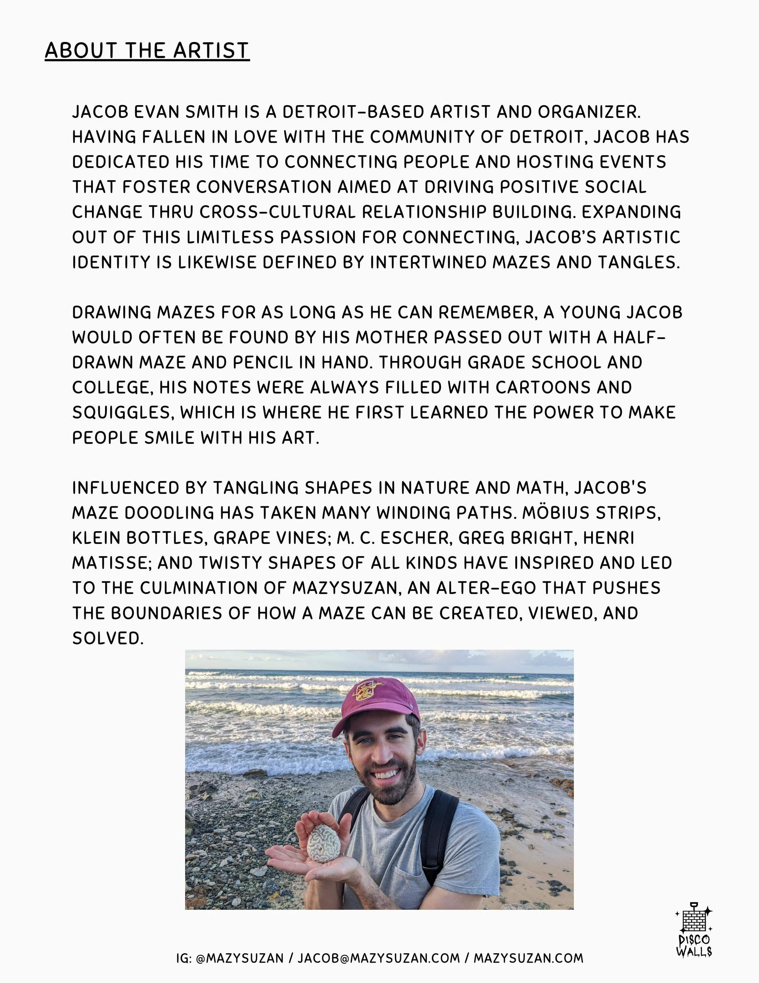 Jacob “MazySuzan” Smith’s first solo exhibit “Mazes & Tangles” will be on display thru Nov. 30, 2022. The gallery (Disco Walls) is open Saturdays 12-6 PM or by appointment (DM @discowalls on Instagram or Facebook to coordinate).